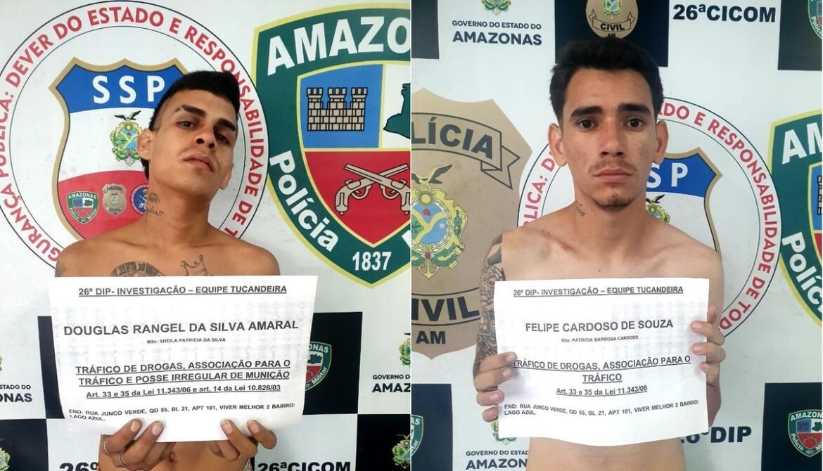 Dois homens identificados como Douglas Rangel da Silva Amaral, de 23 anos, e Felipe Cardoso de Souza, de 24 anos, foram presos em flagrante por policiais do 26° Distrito Integrado de Polícia (DIP), com drogas e munições em um apartamento do Viver Melhor 2, nesta segunda-feira (10).