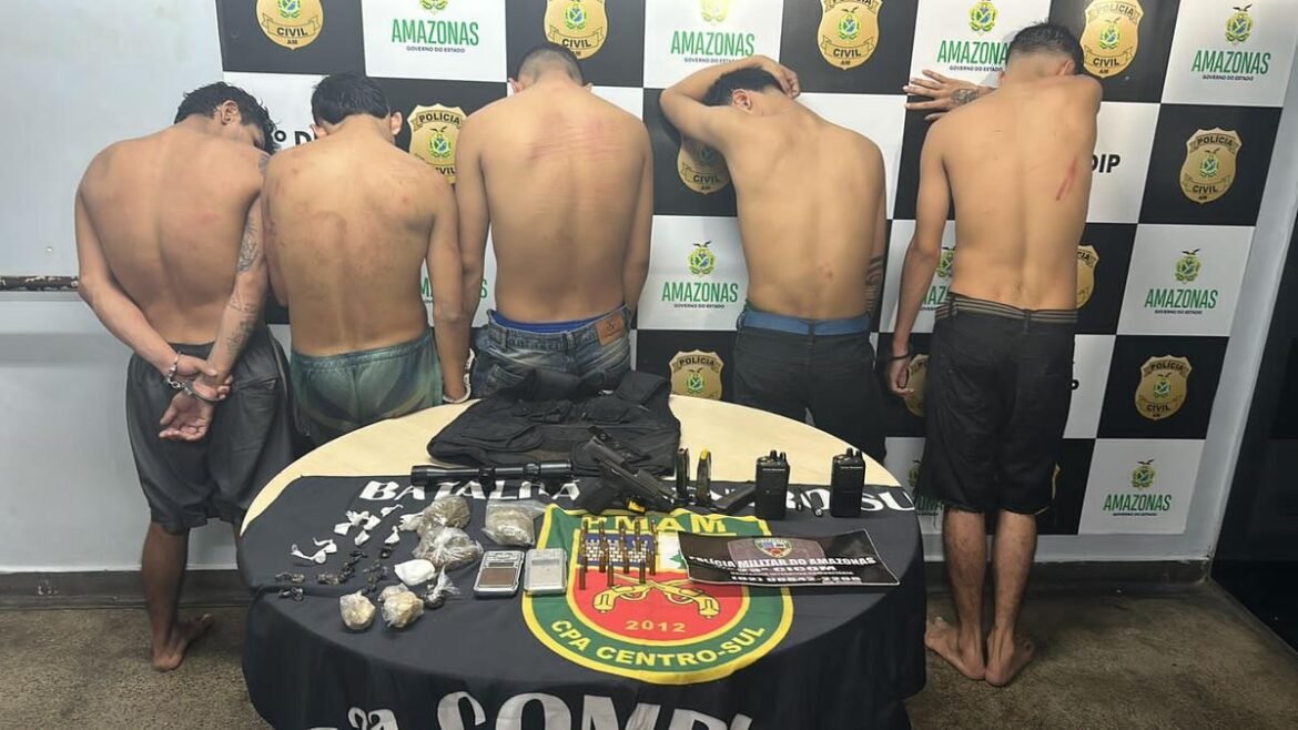 Um grupo criminoso formado por cinco homens identificados como Carlos Eduardo Viana Limeira, 20, Samuel Chagas de Matos, 19, Leonardo Xavier Moraes, 22, André Luís Tavares Queiroz, 22 e Ryan Christian Barbosa da Costa, de 19 anos, foram presos pelos crimes de tráfico de droga e porte ilegal de arma de fogo. As prisão ocorreram na tarde desta quarta-feira (3), na rua 51, bairro da União, zona centro-sul de Manaus.