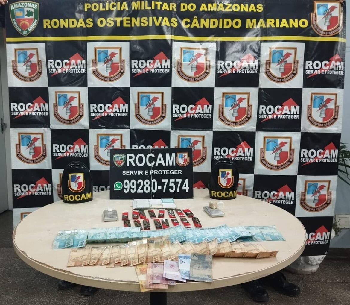 Policiais militares das Rondas Ostensivas Cândido Mariano (Rocam), realizavam uma ação de patrulhamento quando um homem em atitude suspeita, avistou o carro da viatura e iniciou fuga para uma área de mata, momento em que deixou uma bolsa contendo materiais ilícitos e uma quantia em dinheiro para trás.