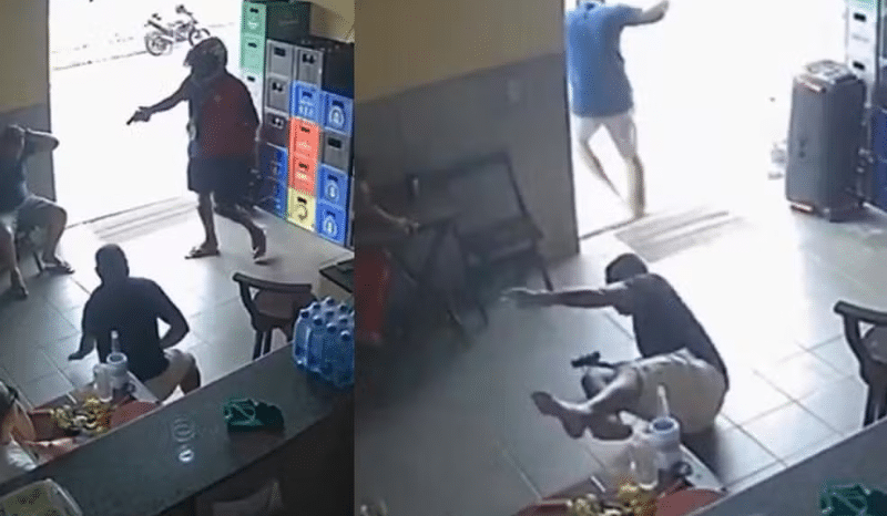 As câmeras de segurança do local registraram tudo. As imagens mostram o momento em que o policial, que estava sentado com outra pessoa, se deita no chão para se proteger. Quando percebe uma brecha, ele saca a arma e dispara quatro vezes contra Raimundo, que cai no chão e morre no local.