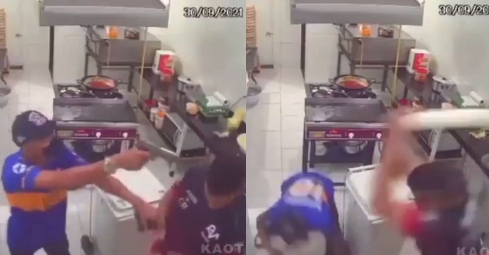 Com o bandido atordoado, o cozinheiro parte para cima e inicia uma luta corporal. Outros funcionários também entram na briga e ajudam a imobilizar o criminoso, que acaba apanhando dentro da cozinha.