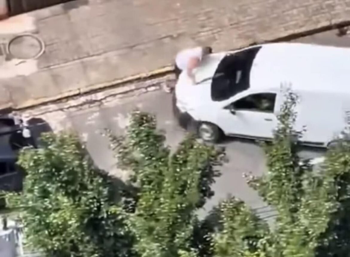 Imagens enviadas à TV Globo mostram o momento em que um homem com um barrote nas mãos caminha em direção a um furgão branco. O veículo dá ré e atropela outro rapaz que estava na calçada. Em seguida, o homem com o barrote corre até o motorista do furgão e o agride várias vezes.