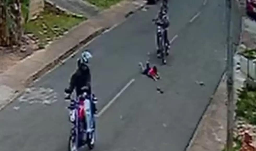 As imagens mostram várias crianças na rua sob supervisão de adultos. Em um momento, o menino corre da calçada para a pista. A primeira moto o atinge e o derruba. Logo em seguida, a segunda moto passa por cima dele. Mesmo ferido, a criança se levanta e sai correndo.